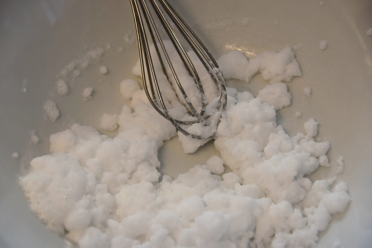 Die Masse sollte nicht schäumen, nur leicht feucht wie Sand wirken. Wahlweise 1-2 Tropfen Essig hinzufügen.